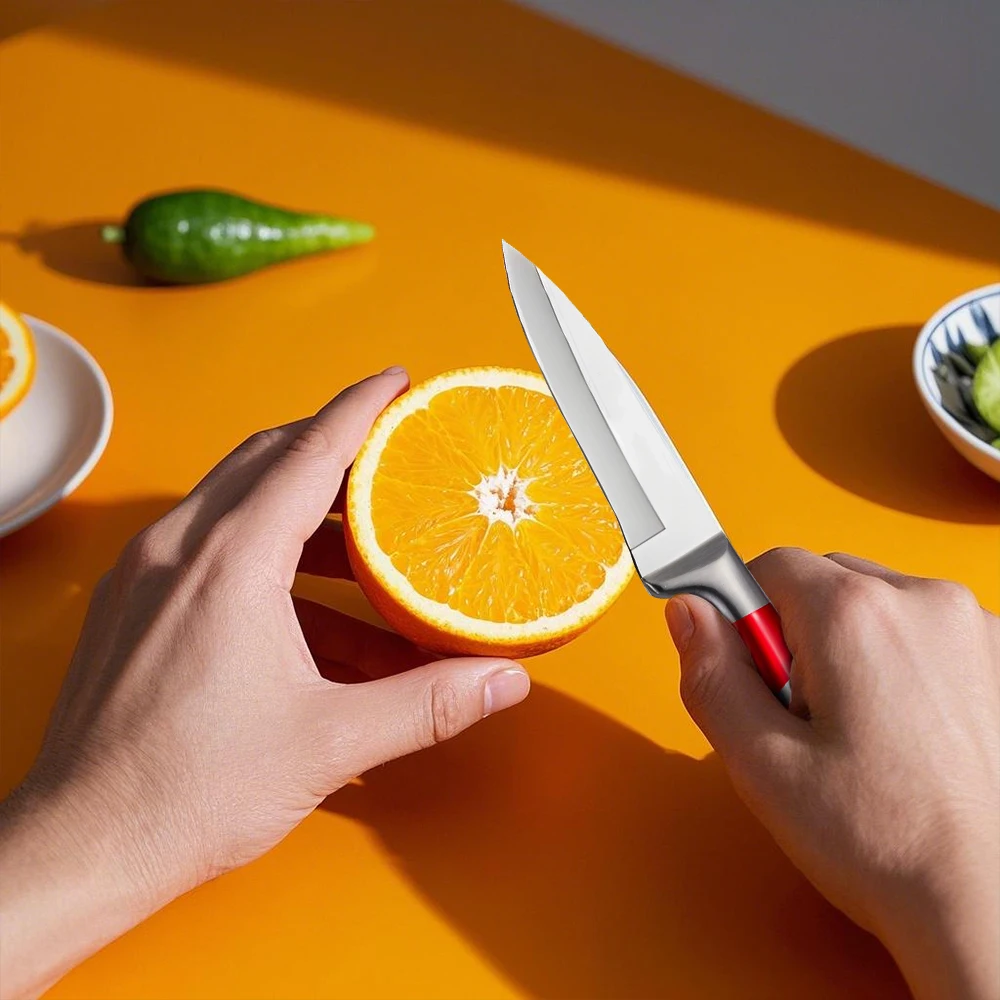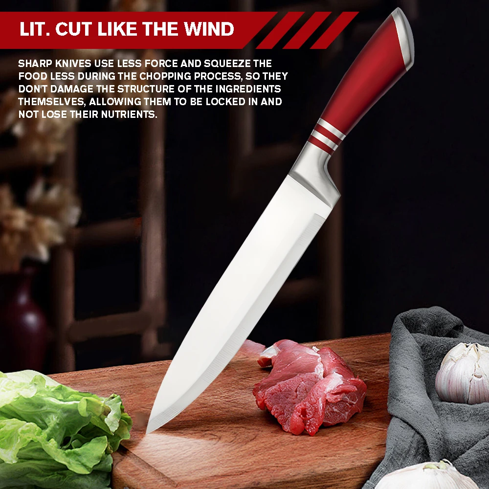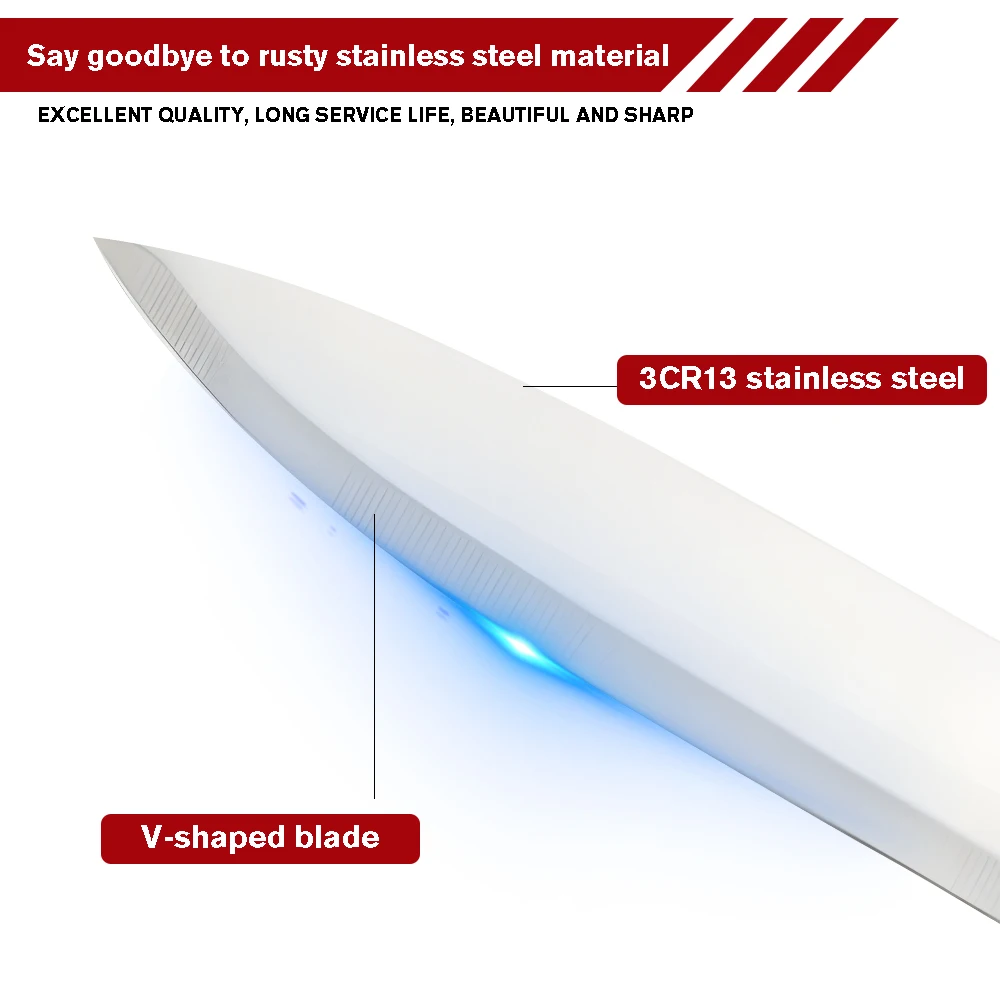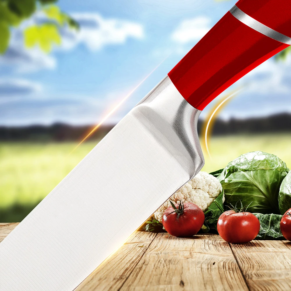 High Quality--This set of knives is made of high-carbon German stainless steel, each is finely ground by artisans by hand for durability, the V-shaped cutting edge is very sharp, and has a hardness that resists stains and corrosion. This set of sharp stainless steel knives will help you tackle every cutting task in the kitchen with ease.
