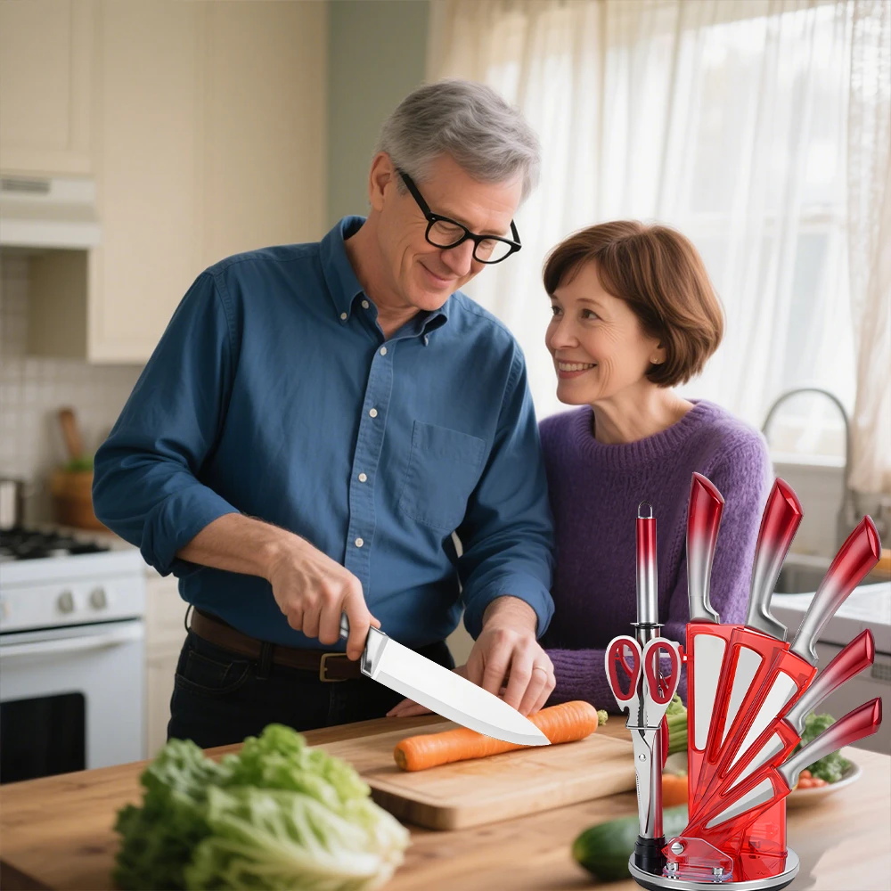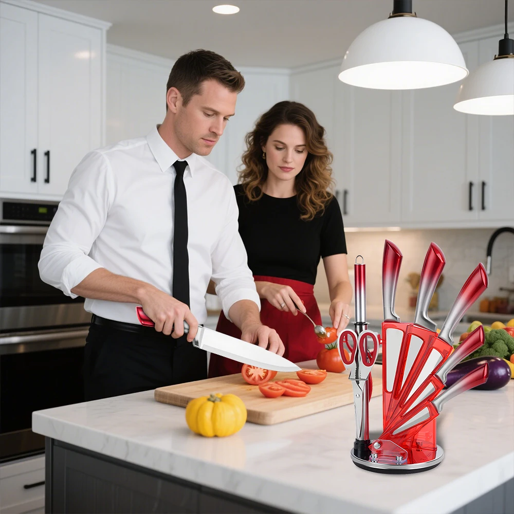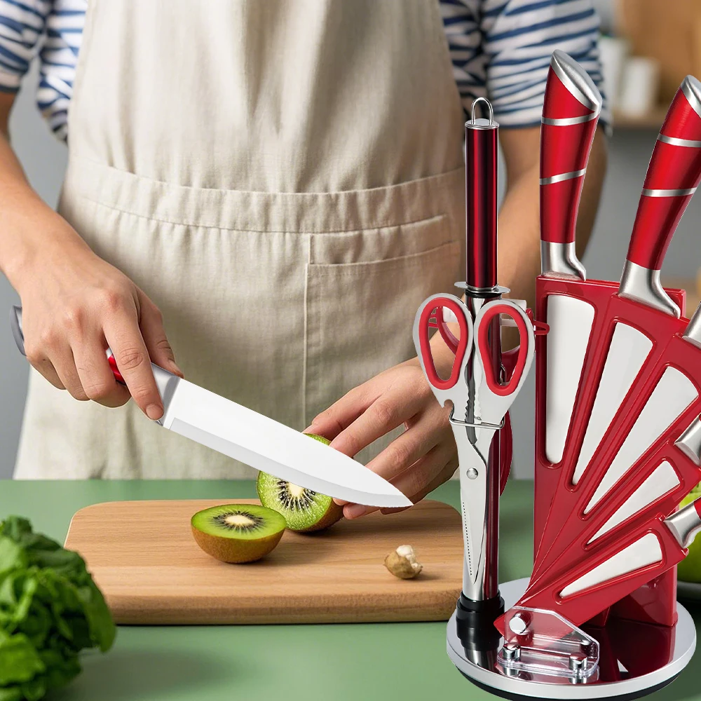 All-in-One--This pink set of knives includes: Chef Knife, Slicing Knife, Bread Knife, Utility Knife, Fruit Knife,Knife Sharpener,Kitchen Scissors,Peeler,Rotary Knife Holder.This 9-piece kitchen knife set is widely used for cutting, slicing, shearing, chopping, and can meet your various cutting needs while cooking.