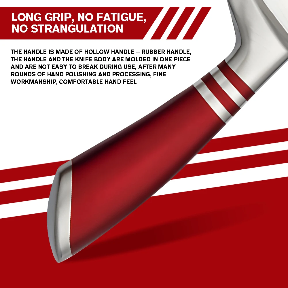 Full Tang Comfort Handle--The chef's knife set is made with an ergonomic hollow horseshoe handle,the handle fits the palm perfectly for optimal grip and comfort during use.The design of the full tang construction not only provides balance for the knife, but also makes the knife stronger, ensure your safety and good experience.